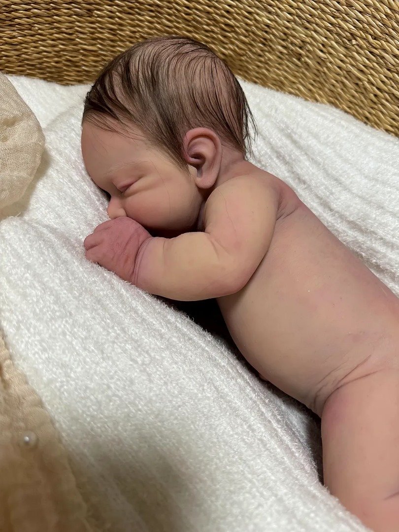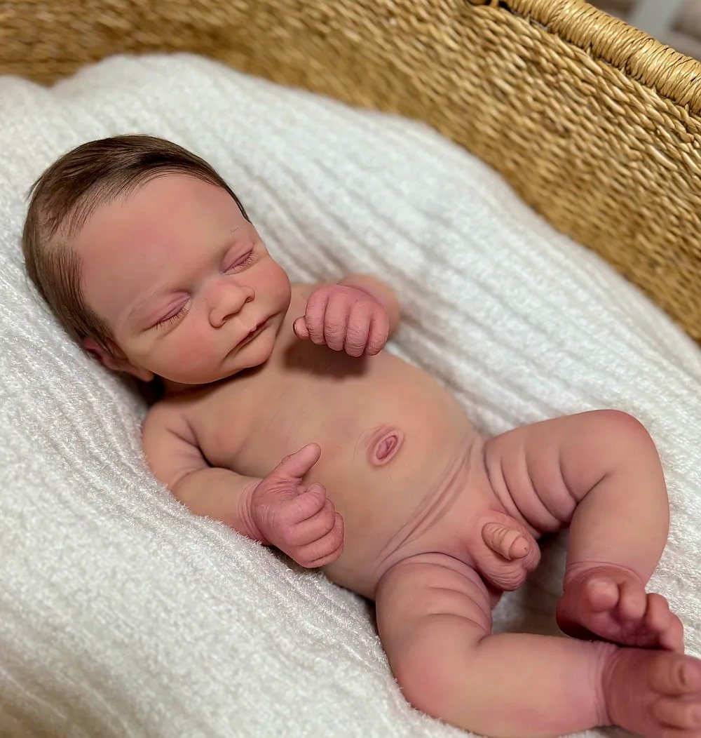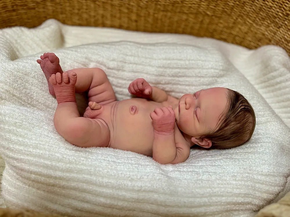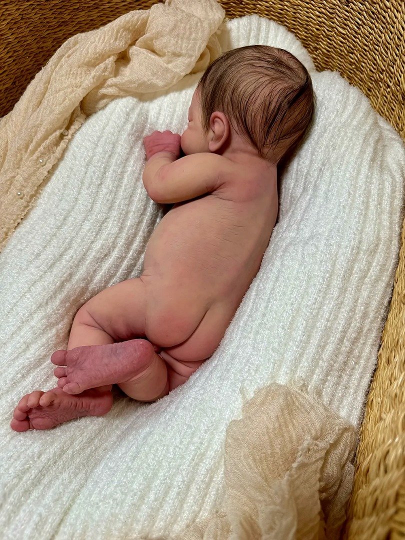 Adorable Tay is a preemie-sized sweetheart! He is a full-body silicone made of a SUPER soft marshmallow blend. His arms and legs have armatures, which make him poseable but still cuddly. 🙂 He has top gums and a cute little tongue, and he can take a preemie-sized pacifier.