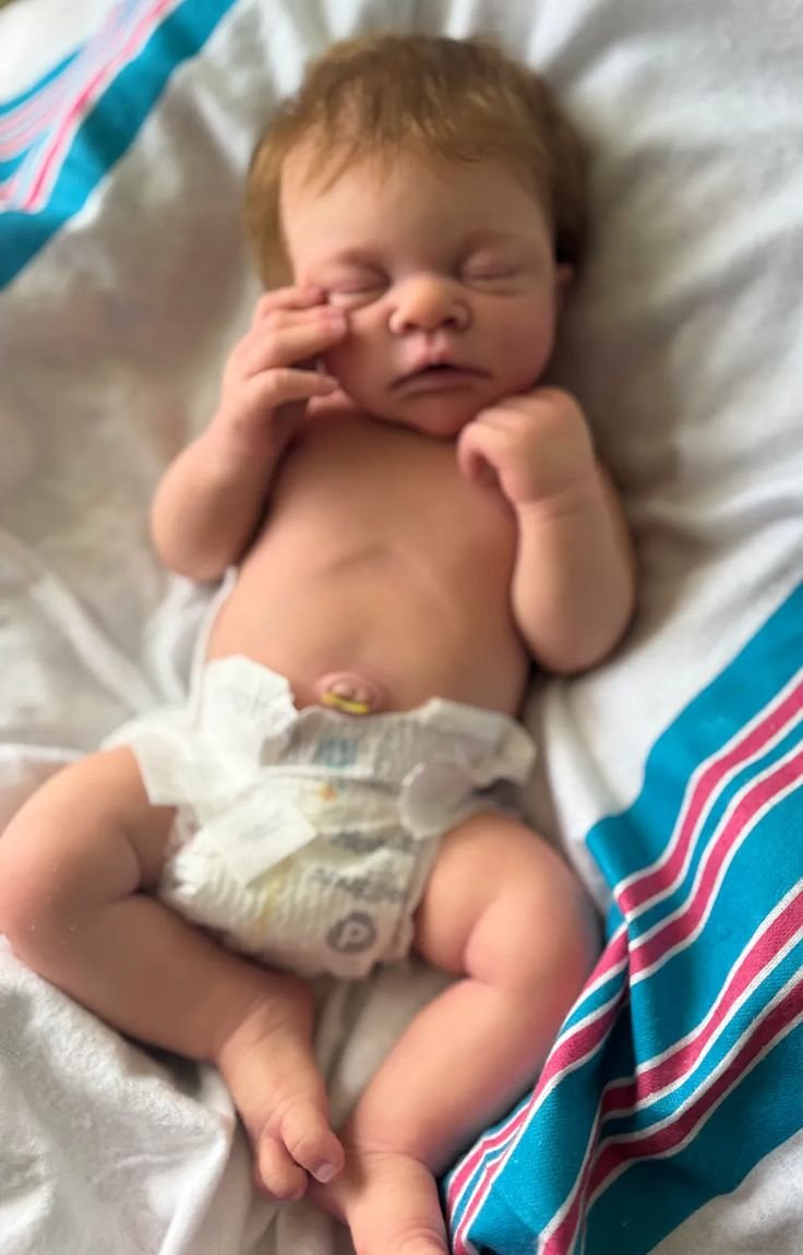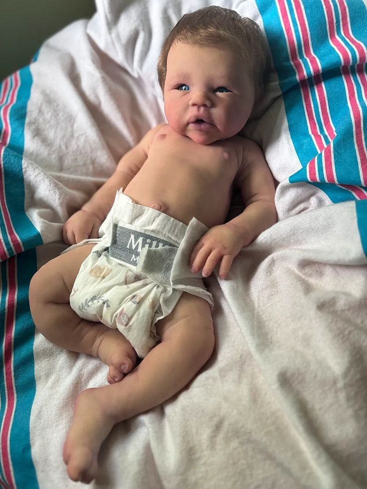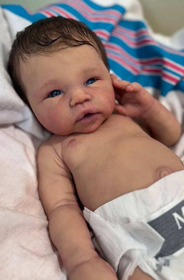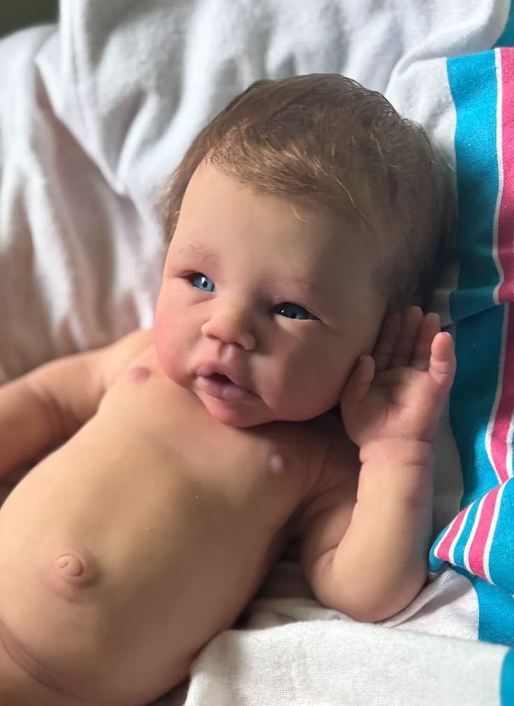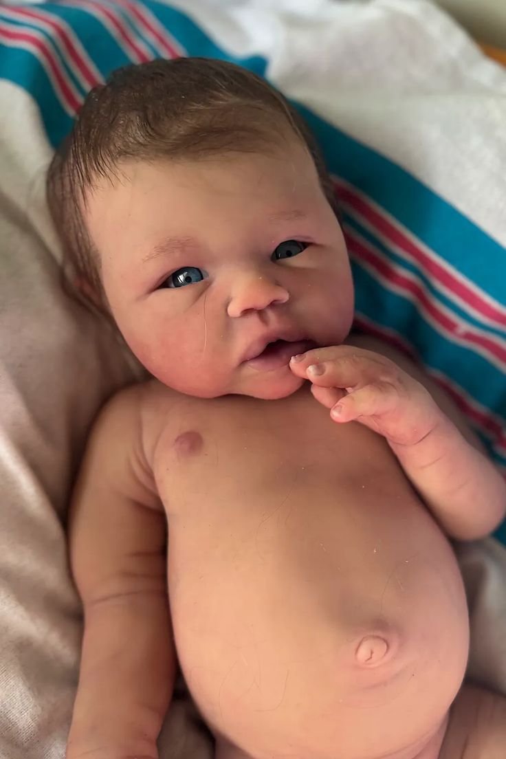 EMI FULL BODY SILICONE sculpt, mold and cast by Jennifer Sussmann-Price. Emi is a newborn size kit at 19in and weighs 7lbs 2oz. Emi is cast in Jen’s custom soft blend platinum silicone she has an open mouth and can take a full pacifier. She has armature in her arms.. She wears newborn size clothing.. She will come with beautiful blue glass eyes. She will be rooted with medium brown male hair.